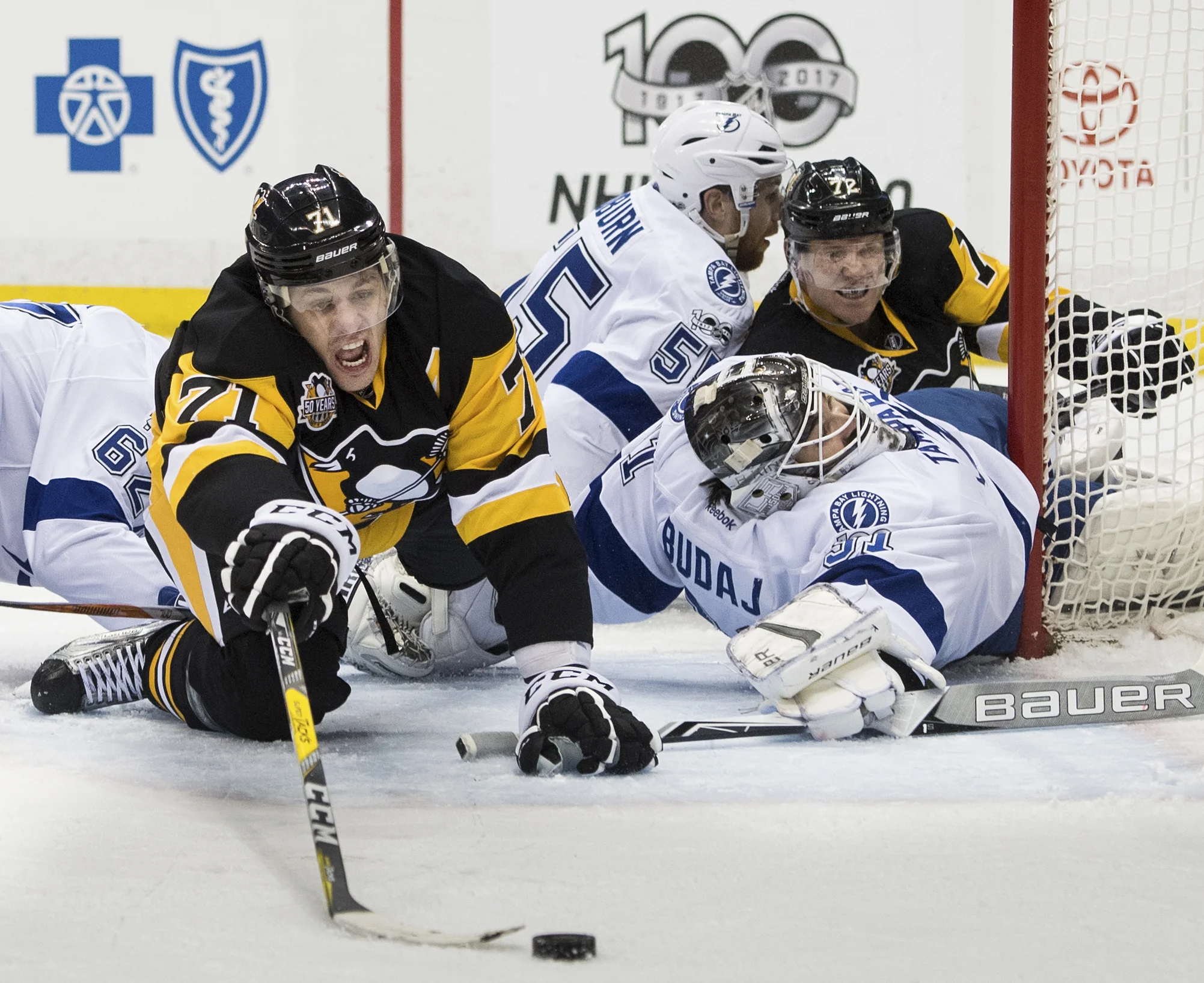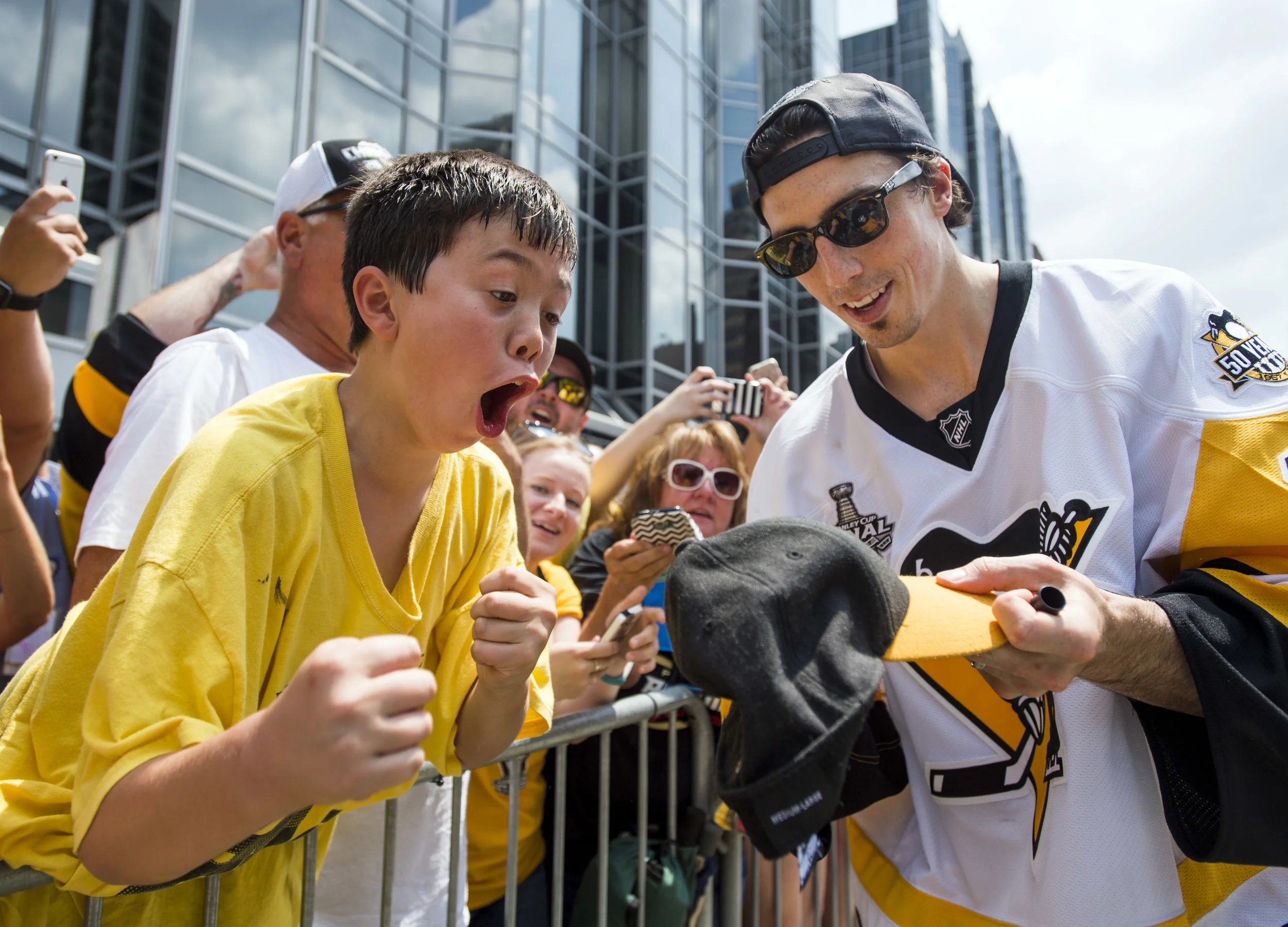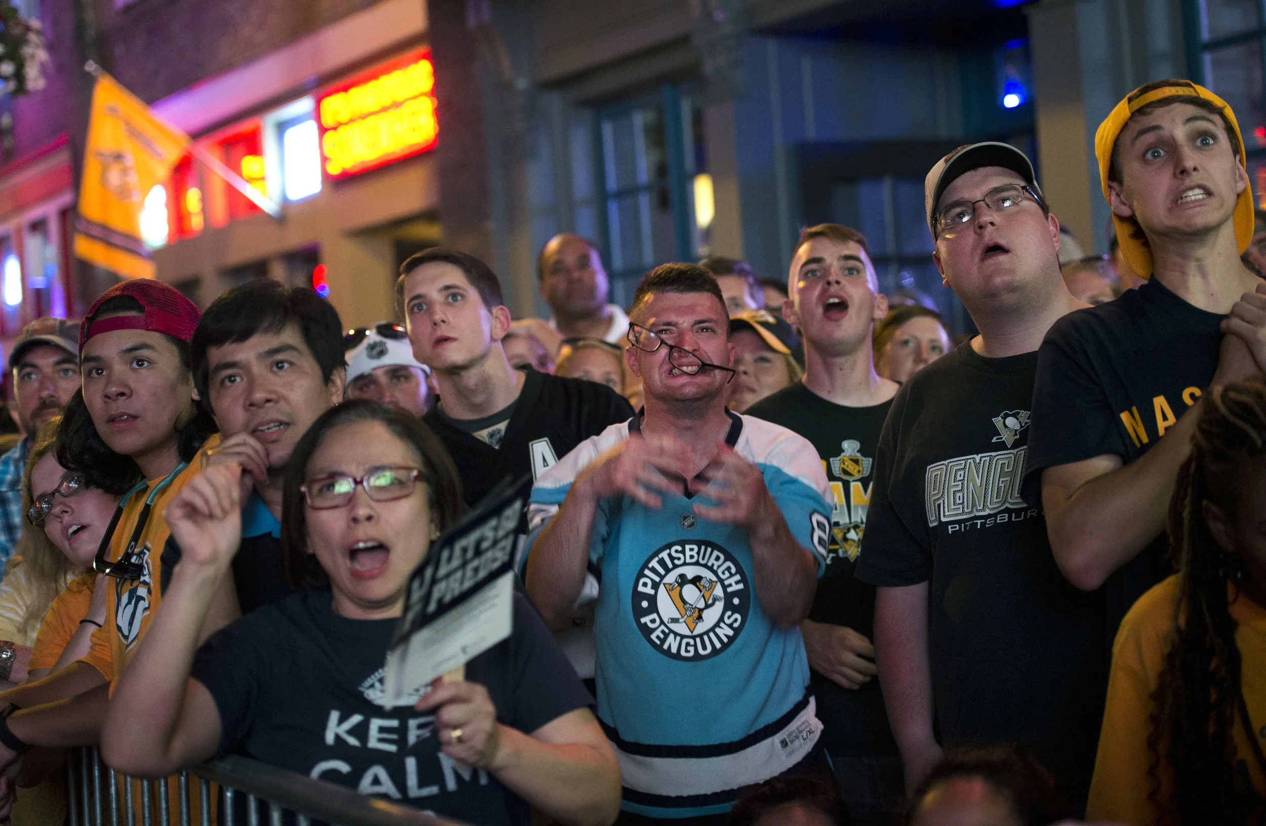 Joey Bova of Bethel Park react as Flyer Valtteri Filppula ties the game while watching the big screen during game 5 of the first-round playoff series against the Philadelphia Flyers on Friday, April 20, 2018, outside PPG Paints Arena. (Steph Chambers/Post-Gazette)