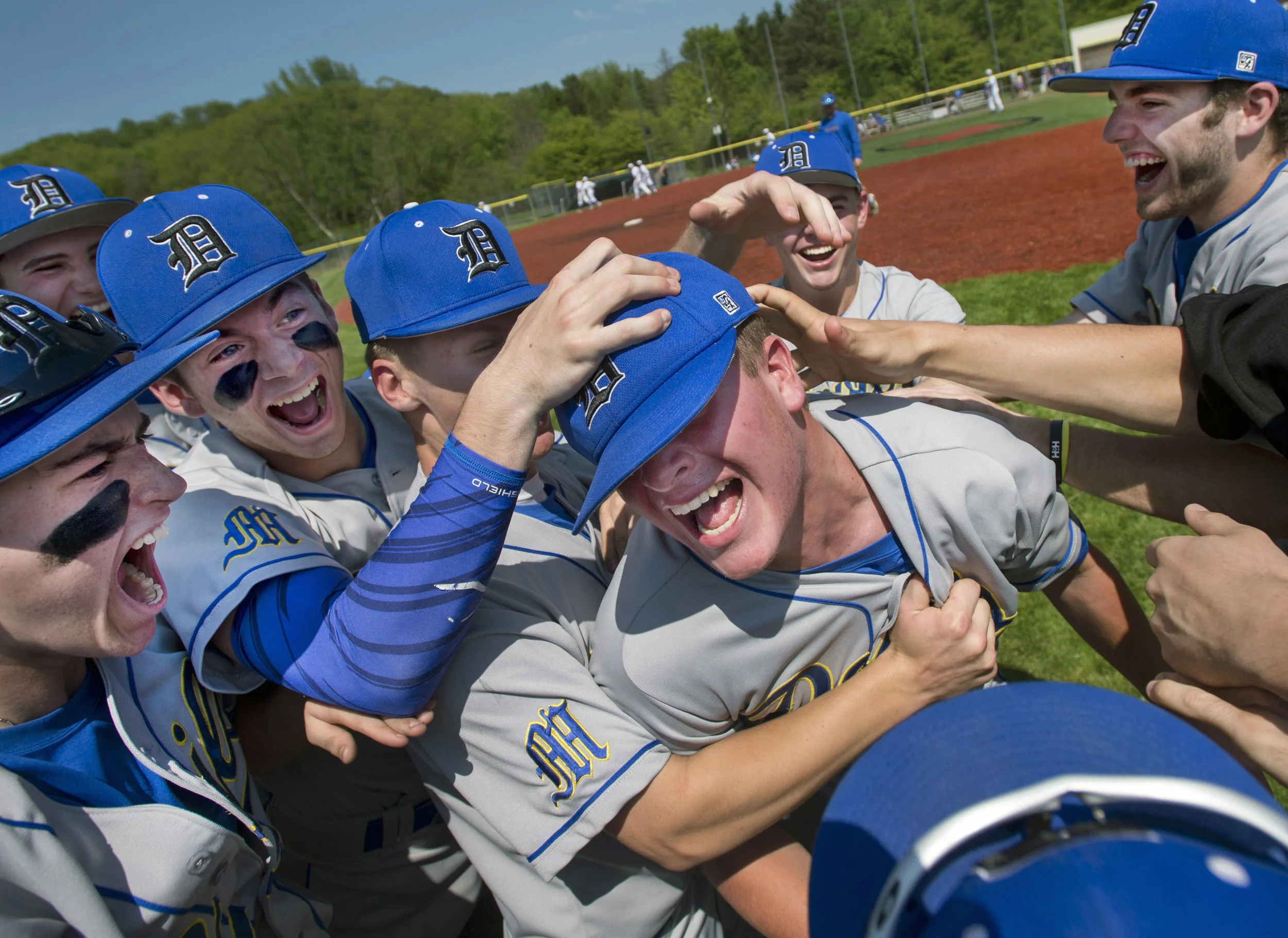 Thomas Jefferson head softball coach Heidi Karcher shows her "believe" lucky sports bra to her players after beating Albert Gallatin 2-0 in 8 innings during the WPIAL Class 5A softball semifinal on Wednesday, May 23, 2018, at Boyce Mayview Park. (Steph Chambers/Post-Gazette)