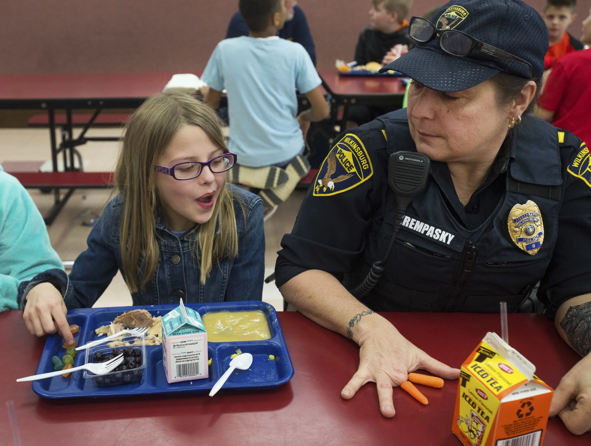 Officer David Shifren knocks off a pawn as Manoj Darjee, 9, of Carrick reacts during a weekly community chess class with Shifren on Wednesday, Sept. 12, 2018, at the Carnegie Library of Pittsburgh in Knoxville. Shifren, a Zone 4 community resource officer, leads chess classes at the Hazelwood branch every Tuesday at 5 p.m., at the Knoxville branch every Wednesday at 4 p.m. and at the South Oakland Frazier Fieldhouse near Dan Marino Field every Thursday at 5 p.m. Shifren earned his Master of Fine Arts degree in fiction writing from the University of Pittsburgh. While conducting research for one of his mystery novels, Shifren participated in a detective ride along, which sparked his interest in police work as a career. Shifren works as an officer in the evenings and writes novels and screenplays in the mornings. He also teaches a film-appreciation class at his alma mater.(Steph Chambers/Post-Gazette)