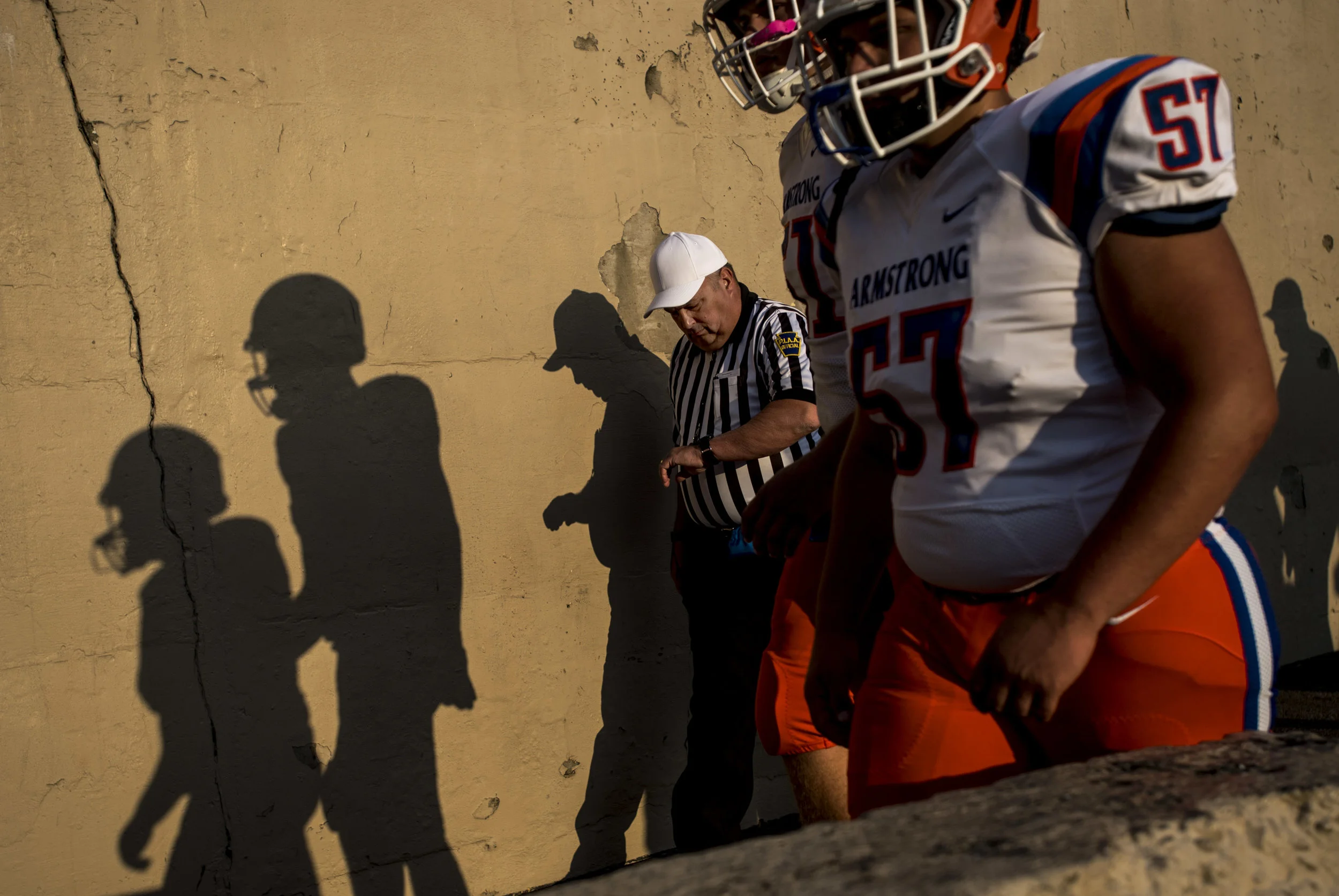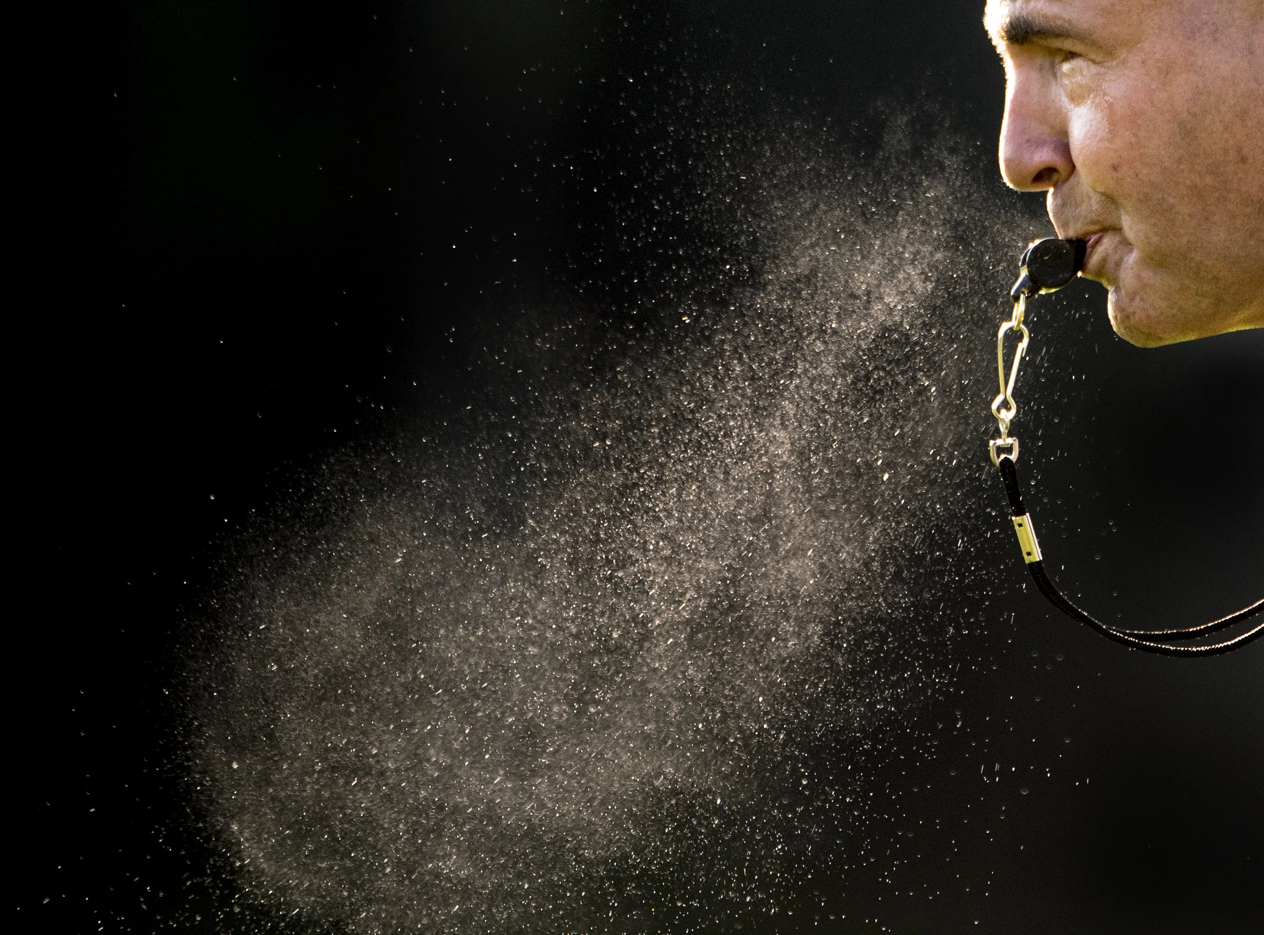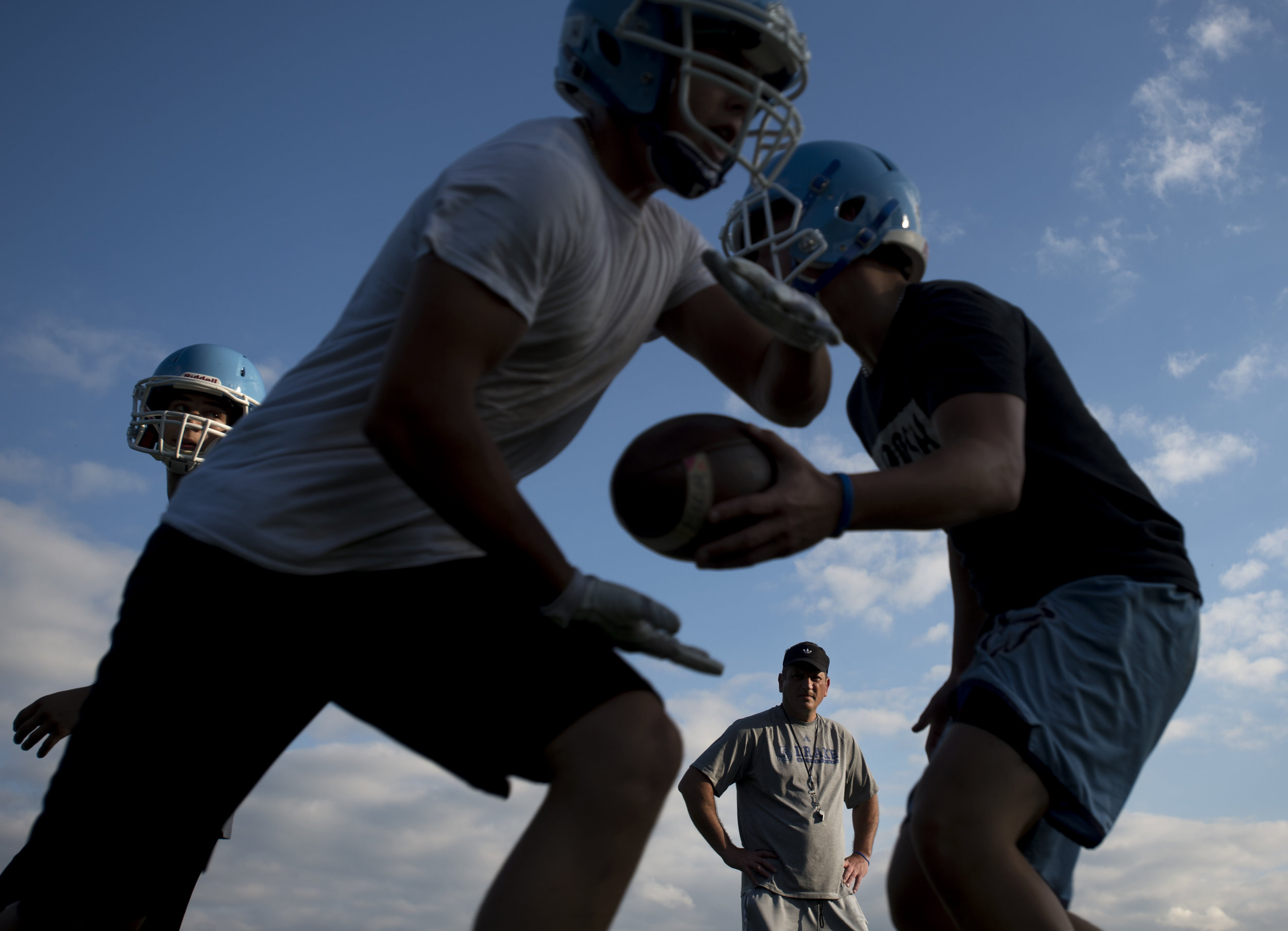 A drop of rain falls from the chin of West Allegheny head coach Bob Palko on Friday, Sept. 21, 2018, at Upper St. Clair High School. (Steph Chambers/Post-Gazette)