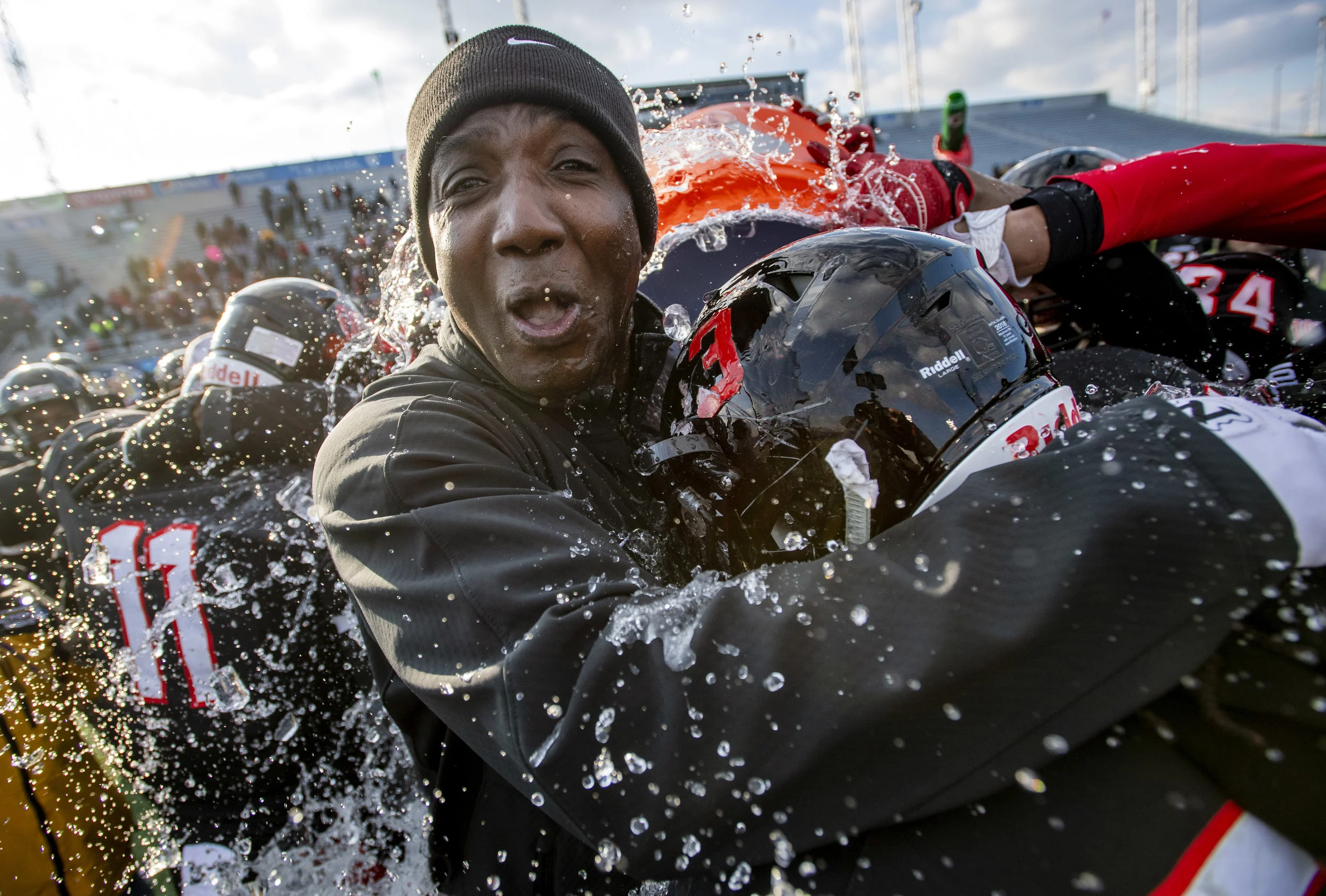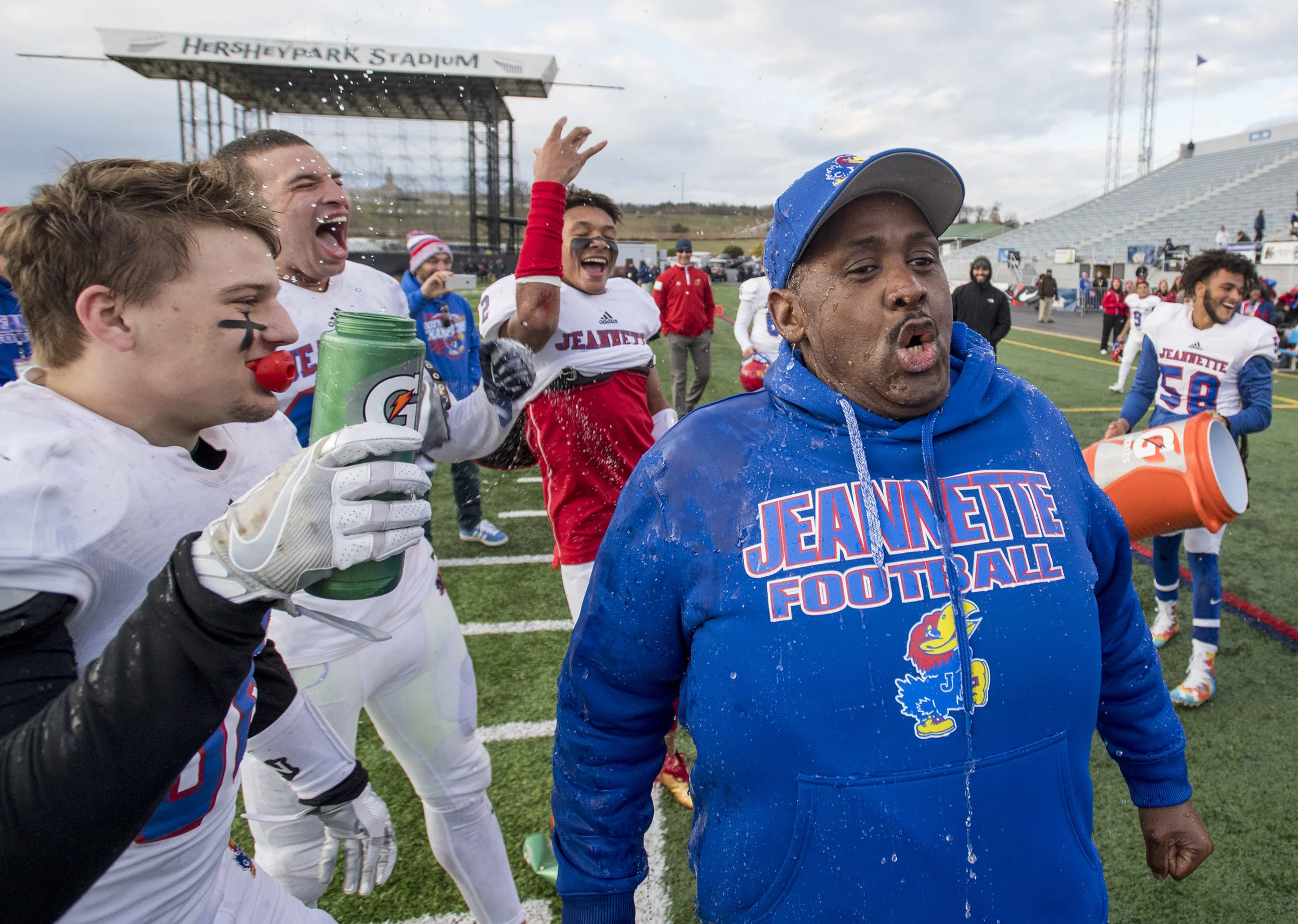 Aliquippa head coach Mike Warfield is doused with water after beating Middletown, 35-0, during the PIAA Class 3A football championship on Saturday, Dec. 8, 2018, in Hershey. (Steph Chambers/Post-Gazette)