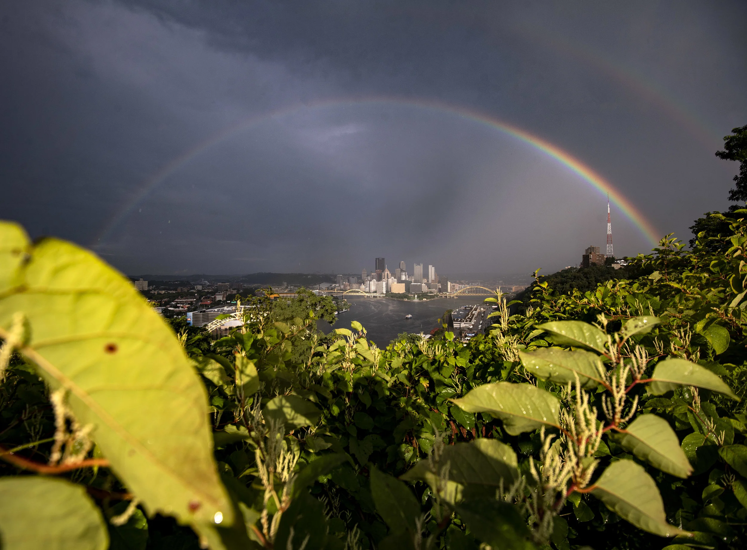 A double rainbow appears over Pittsburgh on Monday, Aug. 13, 2018, seen from West End-Elliott Overlook Park. (Steph Chambers/Post-Gazette)