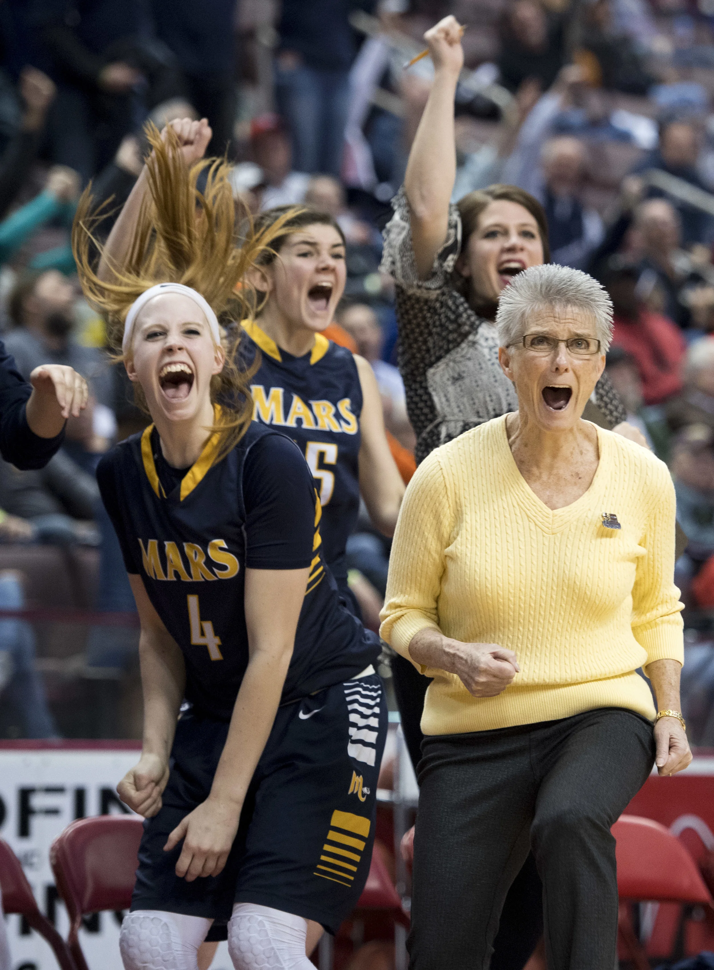 Mars head coach Dana Petruska reacts after Tai Johnson made her shot on a foul during the PIAA class 5A girls basketball championship on Wednesday, March 28, 2018, at the Giant Center in Hershey. Mars beat Archbishop Wood, 36-33. (Steph Chambers/Post-Gazette)